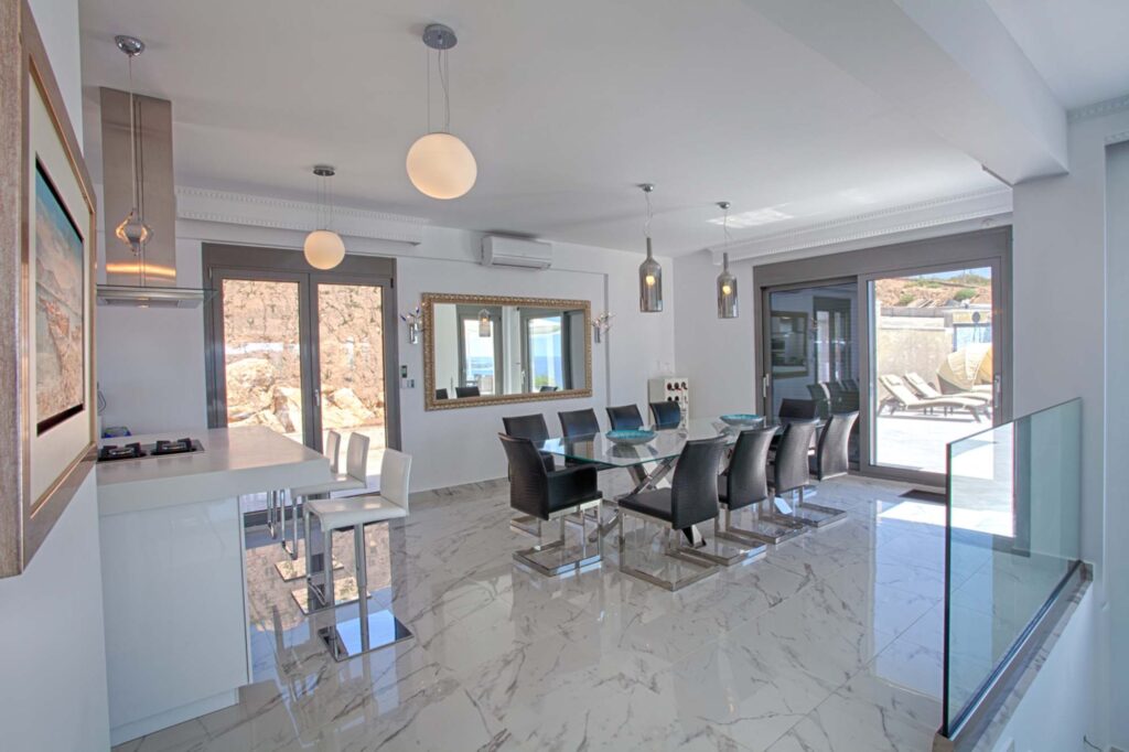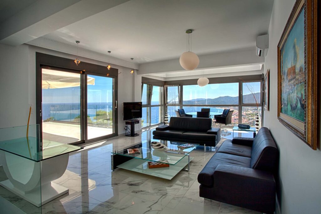The living room, adorned with opulent furnishings and captivating views of the Aegean Sea, evokes the feeling of sailing on the deep azure waters.