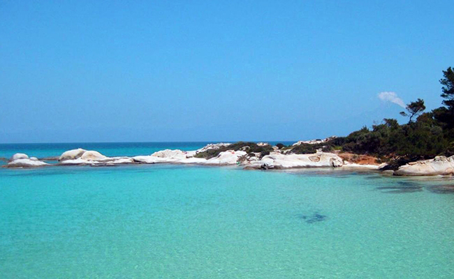 Weiße Sandstrände sind zwischen einzigartigen Felsformationen und Klippen eingebettet und treffen auf die grüne natürliche Umgebung von Sithonia, was ein tropisches Gefühl vermittelt.